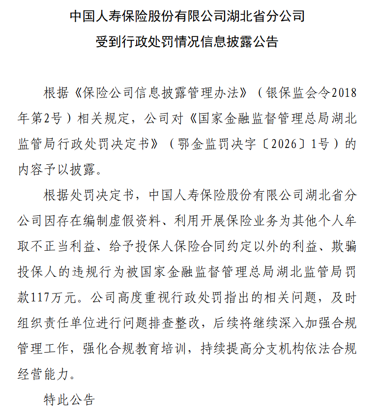 机构之家注意到,近日,中国人寿保险股份有限公司(以下简称“中国人寿”)官网披露一则行政处罚决定(鄂金监罚决字[2026]1号):其湖北省分公司因存在编制虚假资料、利用开展保险业务为其他个人牟取不正当利益、给予投保人保险合同约定以外的利益、欺骗投保人的违规行为被国家金融监督管理总局湖北监管局罚款117万元。