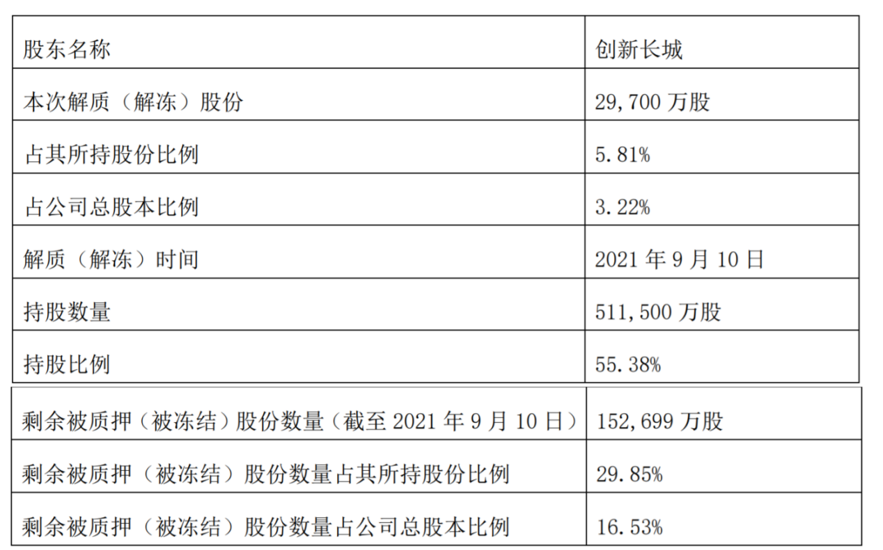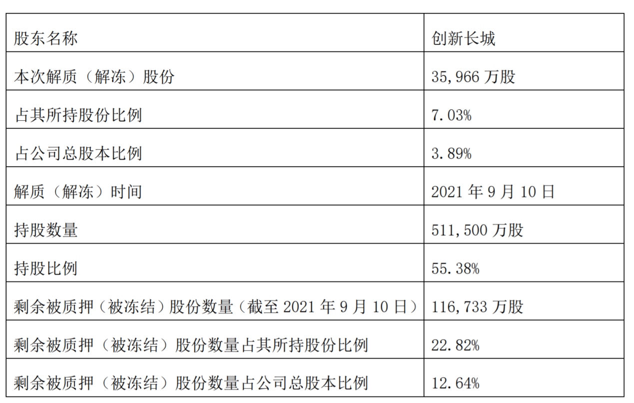此外,创新长城于2021年9月10日将原质押给天津银行股份有限公司保定分行的股份35,966万股解除质押,上述解除质押相关登记手续已办理完毕。具体情况如下: