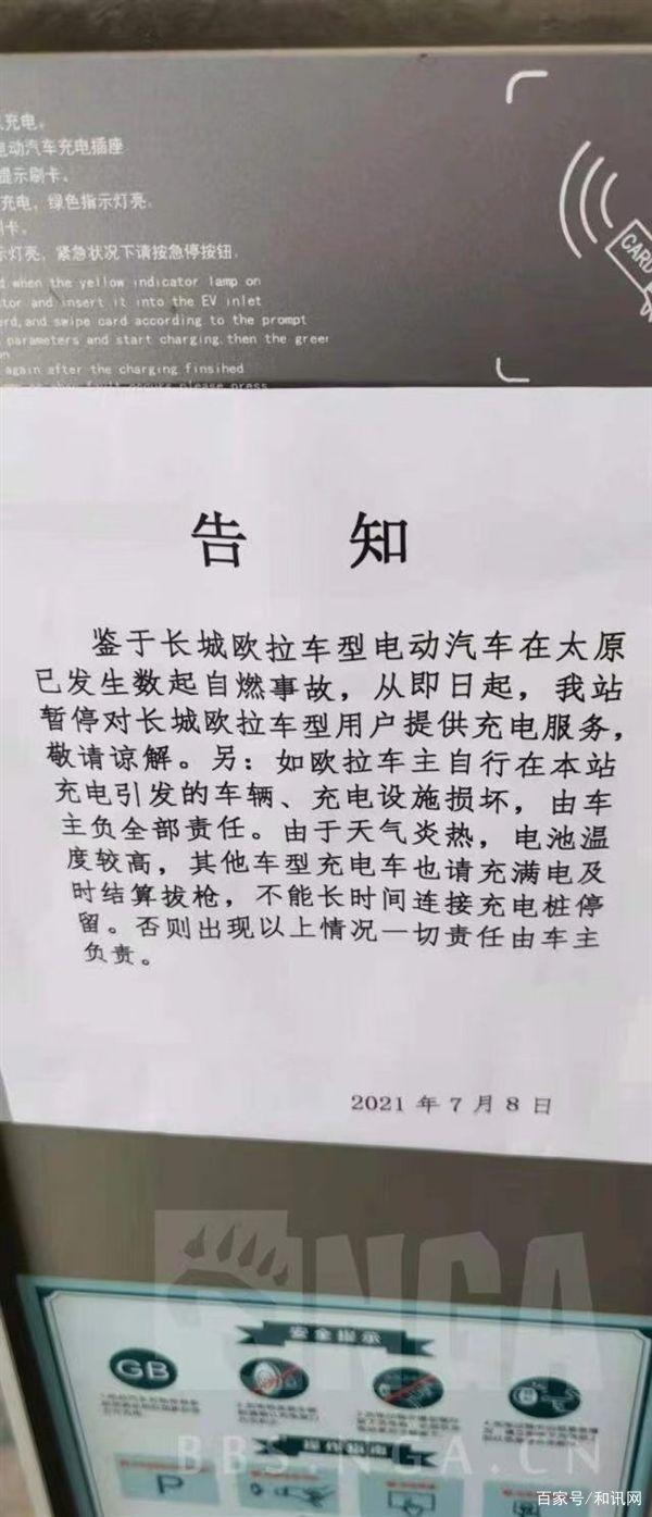 其上称:鉴于长城欧拉车型电动汽车在太原已发生数起自燃事故,从即日起,我站暂停对长城欧拉车型用户提供充电服务,敬请谅解。如欧拉车主自行在本站充电引发的车辆、充电设施损坏,由车主负全部责任。