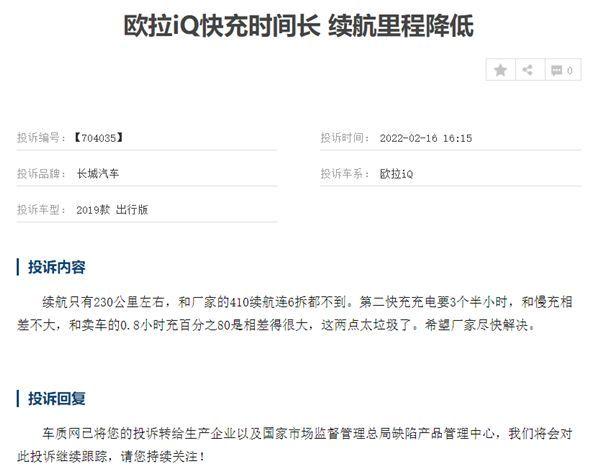 车主投诉内容介绍,其20款长城欧拉iQ出行版,NEDC工况续航里程可达401公里,其升级前续航能达到360公里,但召回升级后只能跑260公里,减少100公里左右。