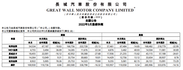 但二级市场不买账,似乎就意味着,长城这几份成绩单的高光背后,隐忧也同样突出,这一点主要体现在了整车产品的销量方面。