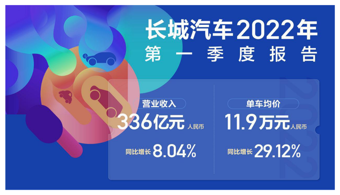 最新的财报显示,2022年Q1,长城汽车单车均价达到11.9万元,同比增长2.7万元,环比增长0.4万元,单车营收创历史新高。