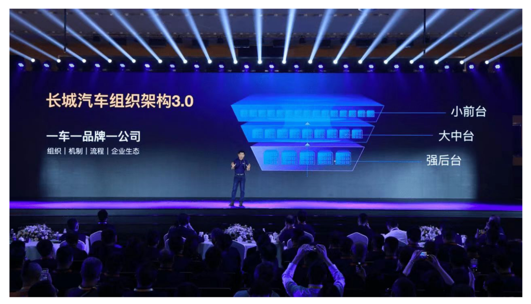 对内,完成了从金字塔型向互联网架构的转变。“扁平化”的管理模式,大幅提升了企业工作效率,加强了部门间的协同作战能力,“强后台、大中台、小前台”打造了良性的组织型态,“一车一品牌一公司”的分工提升了用户服务能力。