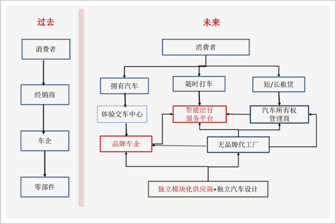 价值链将向后移,原有等级森严的供应链格局将从垂直结构向扁平化网状模式迁移,整车厂也需要完成从制造商向服务商的转型。