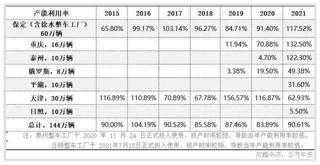 2021年产能利用率刚到90%,公司又开始从地方政府手中购入一些准备出售的弱势工厂,比如汉腾汽车上饶工厂和汉龙汽车大冶工厂等。