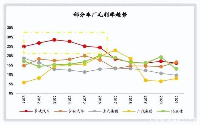 可以看到2016年前,这个数字维持在25%水平附近,同行业绝大部分对标车企毛利率低于20%。