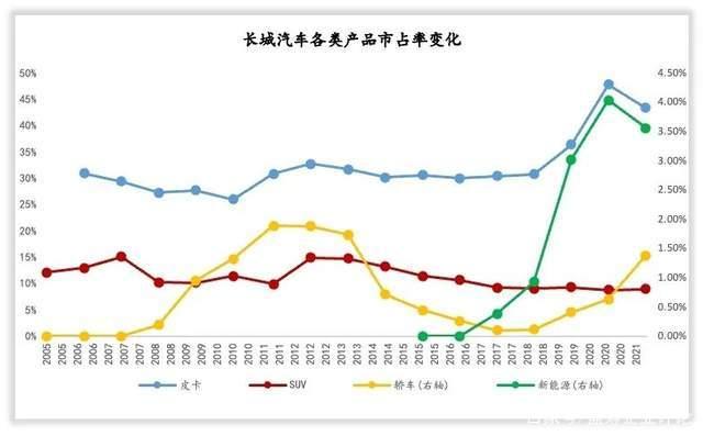 令人担心的是,从公司各类产品过往的市占率来看,只有皮卡业务保持一家独大的高位,明星SUV产品近年来有微小的下调,新能源汽车虽然上升趋势强劲,但市占率尚不足5%。