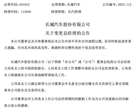 7月24日晚间,长城汽车股份有限公司(下称长城汽车,601633.SH)发布公告称,公司董事会收到总经理王凤英的书面辞职报告,其因工作调整申请辞去总经理职务,但将继续从事战略管理相关工作。同时,董事会同意提名穆峰为总经理。