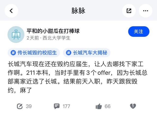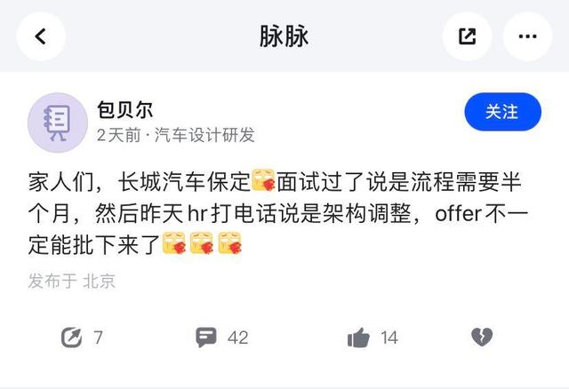 除该名应届生外,也脉脉用户发帖表示自己也遭遇了类似的经历。据该网友描述,自己被长城汽车hr通知“公司架构调整,offer不一定能批下来”。