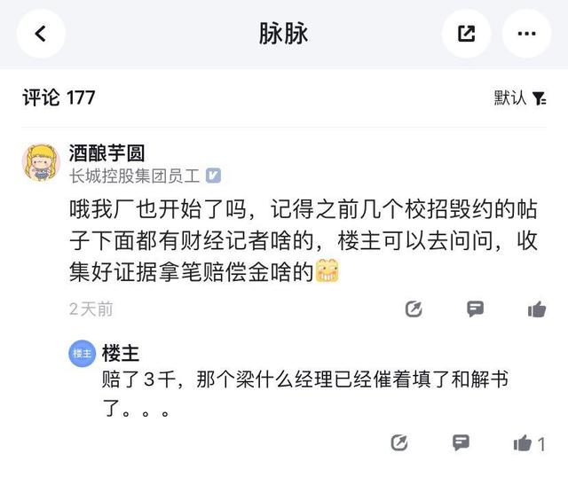 随后应届生补充了更多细节,长城汽车并未与自己签订劳动合同,仅签订了三方协议。在提出解约后长城汽车提供了3000元作为赔偿金,目前该应届生已经填写和解书。