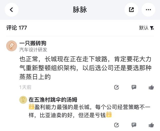 还有脉脉网友对长城的经营情况持乐观态度,称目前“盈利能力最强的是长城,每个公司经营策略不一样,卖得好并不代表盈利好”。
