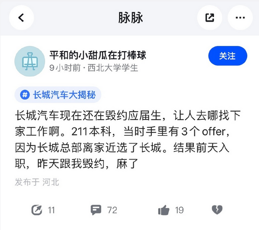 据脉脉上的帖子显示,该毕业生毕业于某211本科大学。在手里有三个offer的情况下因为家近选了长城汽车,结果在入职的第2天即遭到毁约。