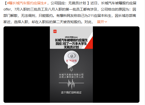 事实上,此前已经有多家车企被爆出毁约“校招应届生”的事件。