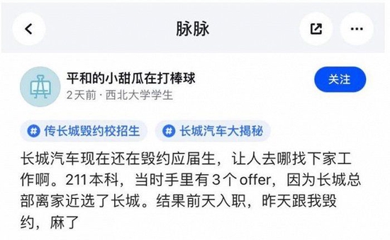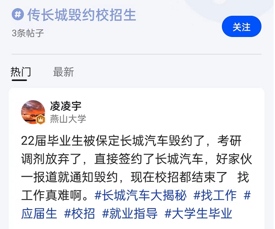 有报料人在平台话题跟贴上写道:“22届毕业生被长城汽车毁约,之前放弃了考研调剂,直接签约了长城,结果一报道就被通知毁约,现在校招都已经结束,找工作真难。”