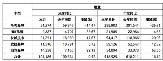 数据上,上交所公布的长城汽车产销公告显示,由于今年以来疫情和芯片短缺等相关因素影响,长城汽车上半年整体销量同比下滑16%,比去年同期减少了近10万辆,曾经创下销量奇迹的明星车型H6,也被今年实现销量暴增的比亚迪宋在销量方面实现超越。旗下五个子品牌中,只有欧拉和坦克实现增长。