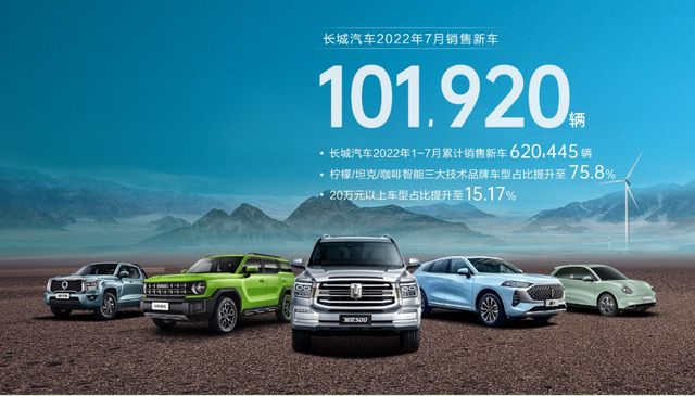 日前,长城汽车正式公布7月份销量,当月销量101,920台。其中哈弗品牌7月销售61,279台,哈弗H6销售27,638台;魏牌7月销售3,034台,环比增长5.09%;欧拉品牌7月销售8,829台,同比增长21.76%;坦克品牌7月销量12,473台,同比增长128.03%;长城皮卡7月销量16,305台,其中长城炮销售10,490台。