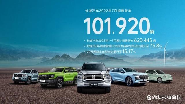透过销量数据,有一个很明显的信号,那就是长城汽车的品牌向上做的真的很成功,因为长城汽车的高价值、智能化产品销售占比不断提升,7月,长城汽车20万元以上车型销量占比达15.17%,智能化车型销量占比达88.32%,基于柠檬、坦克和咖啡智能三大技术品牌打造的车型销售占比达75.8%,这个数据无论是较去年,还是较今年6月,都有着不同程度的增长,可以看出长城汽车品牌向上的趋势一直在继续。