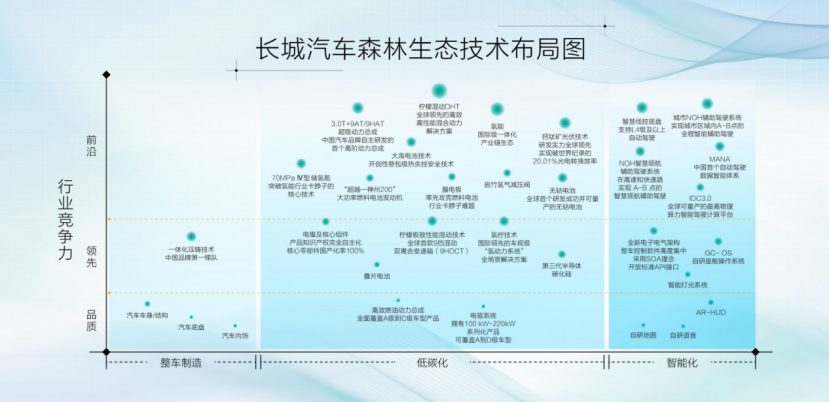 截至目前,长城汽车已布局纯电、混动、氢能和高效燃油等多种动力形式的技术应用,并拥有自主研发的智能驾驶解决方案、智慧线控底盘、智能座舱等相关技术。而这些核心技术的掌握,助力长城汽车在有限的时间内快速战略产业变革制高点。
