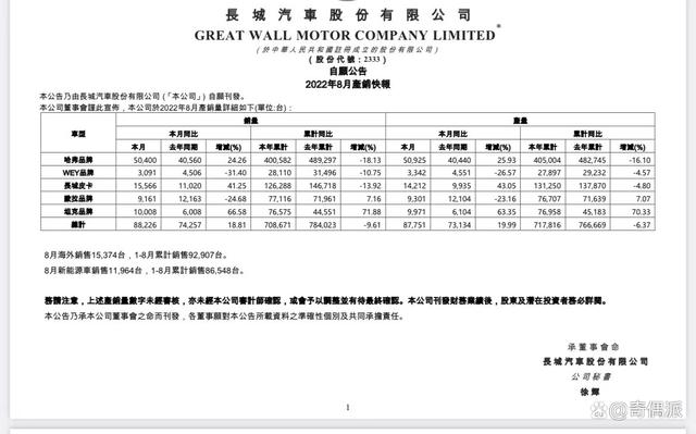 其中,2022年8月长城汽车产销快报显示,哈弗品牌截止8月销售400582辆,同比减少18.13%;WEY品牌累计销售28110辆,同比下跌10.75%;长城皮卡累计销售126288辆,同比减少13.92%。