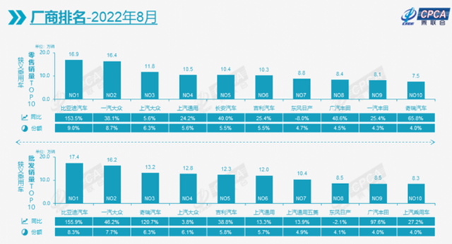 据汽车行业协会公布,全国汽车批发销售排名的十强公司有:比亚迪,一汽大众,奇瑞,上汽大众,吉利汽车,上汽通用,上汽通用五菱,东风日产,广汽丰田,上汽。而长城,曾经的三大自主品牌,却在前十之外,从政府的消息中得知,长城在八月份的时候,一共卖出了88226台新车,不过,据乘联统计,长城在全国的批发量和零售额上,都没有排到十大。