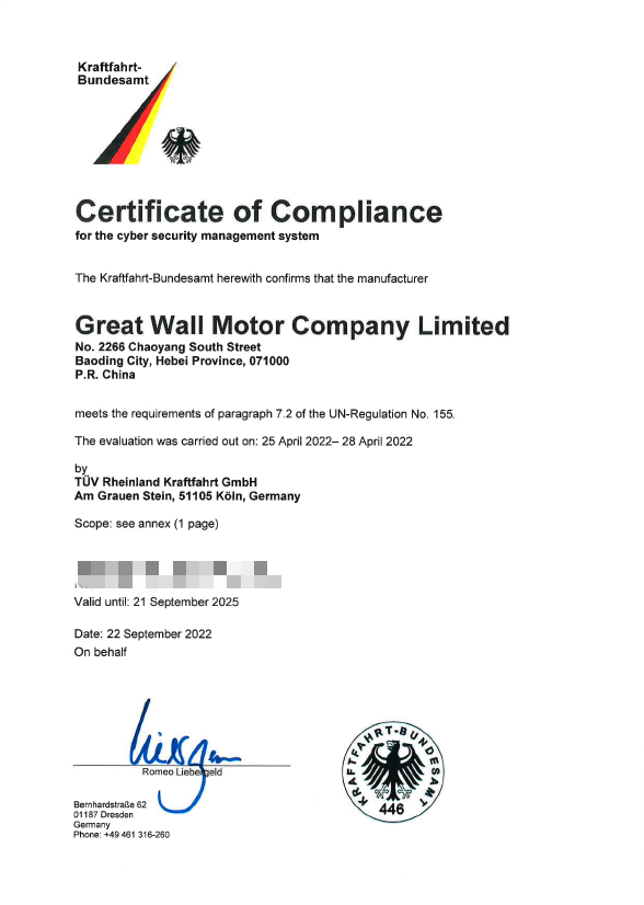 近日,长城汽车股份有限公司(以下简称“长城汽车”)成功获得德国联邦机动车交通管理局(KBA)颁发的UN R155(联合国欧洲经济委员会第155号法规)车辆网络安全管理体系(Cybersecurity Management System, CSMS)符合性证书,成为国内首家获得德国KBA颁发此项认证的公司。