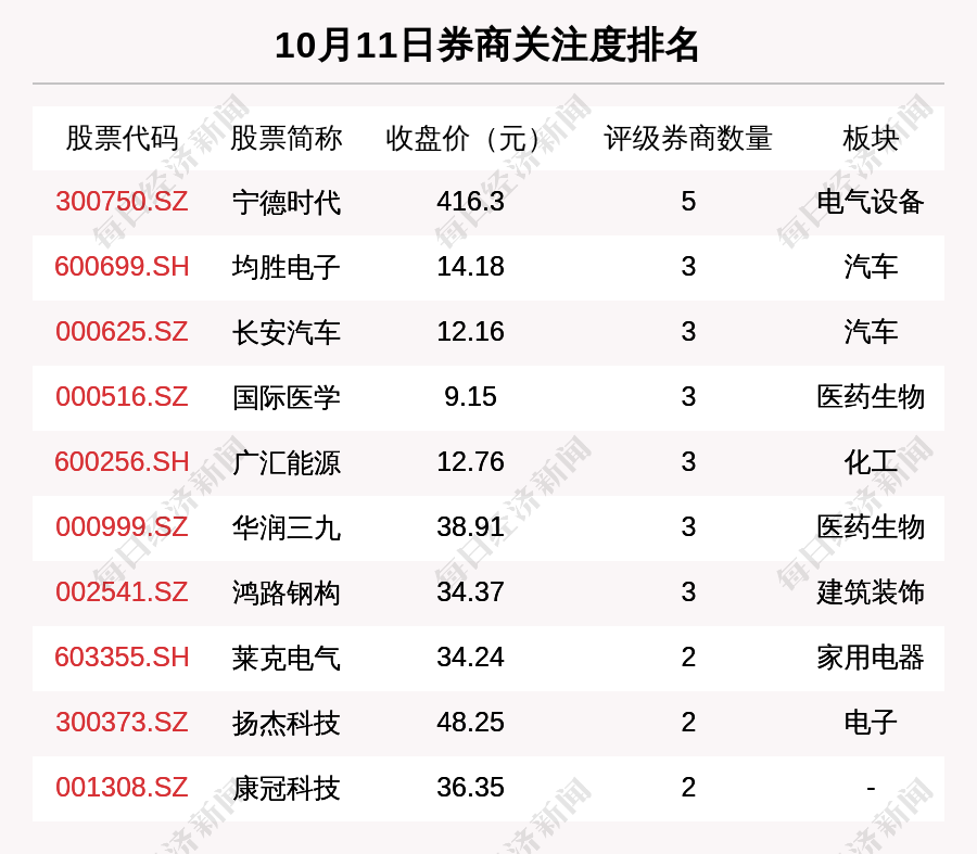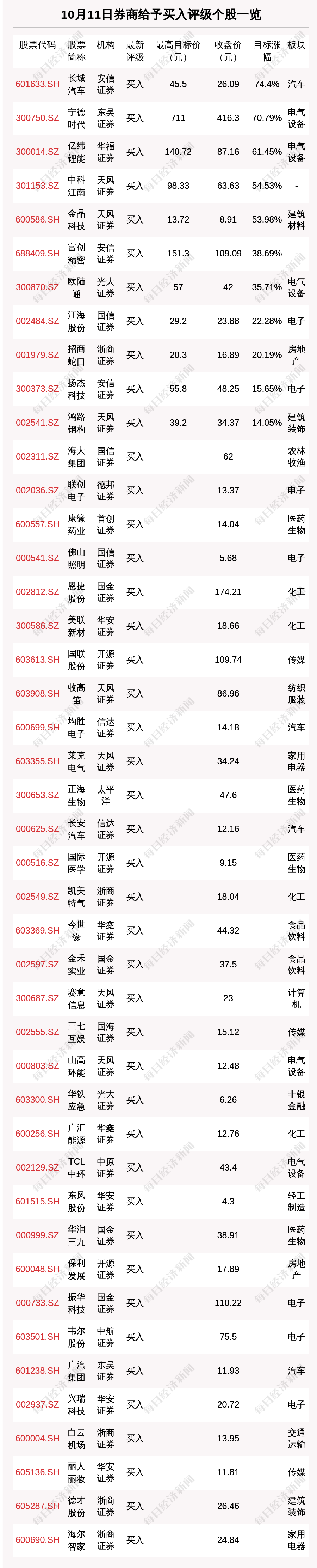 10月11日,券商给予评级的个股数共有62只,获得买入评级的个股数共有44只。在公布了目标价格的11只个股中,按照最新收盘价计算,预期涨幅排名居前的个股是长城汽车(601633.SH)、宁德时代(300750.SZ)、亿纬锂能(300014.SZ),预期涨幅分别是74.4%、70.79%、61.45%。