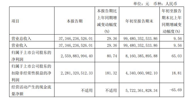 10月21日电 21日盘后,长城汽车在港交所发布三季报称,第三季度营收373.46亿元,同比增29.36%;归属于上市公司股东的净利润为25.60亿元,同比增80.74%;基本每股收益为0.28元。