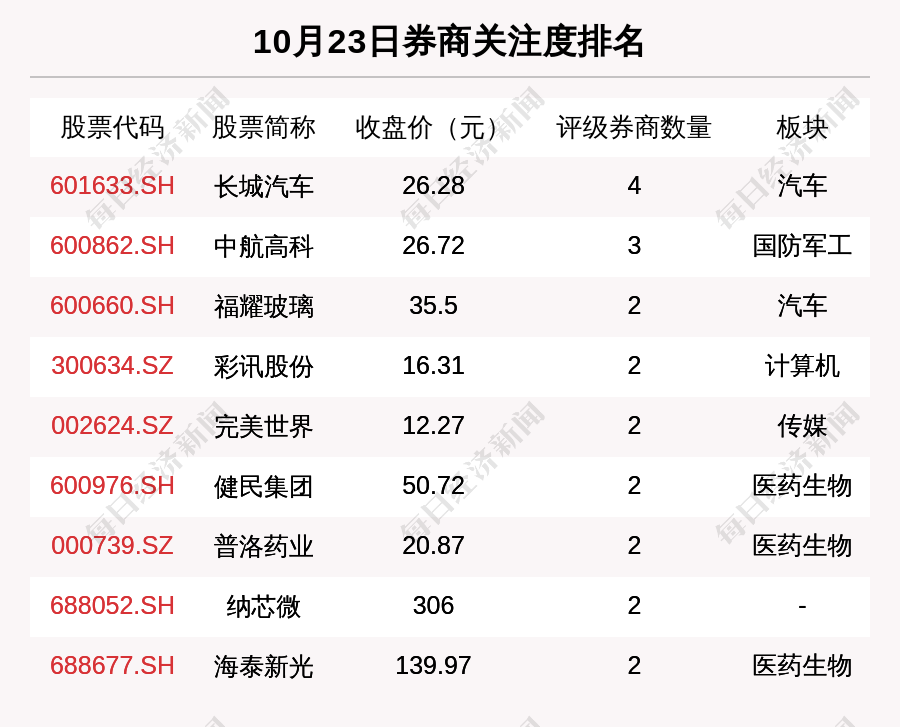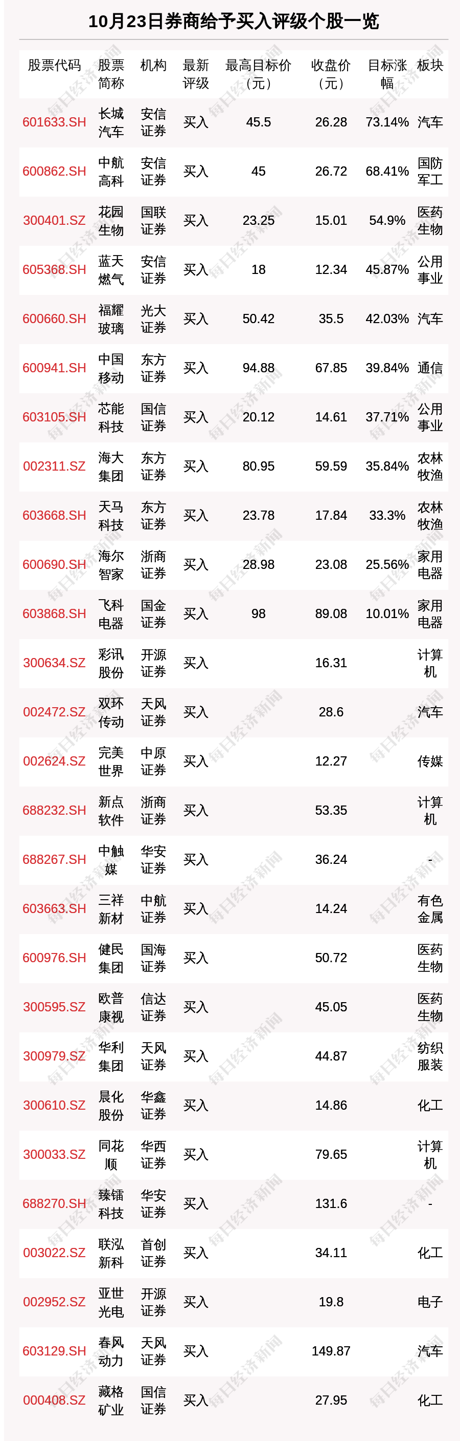 10月23日,券商给予评级的个股数共有41只,获得买入评级的个股数共有27只。在公布了目标价格的11只个股中,按照最新收盘价计算,预期涨幅排名居前的个股是长城汽车(601633.SH)、中航高科(600862.SH)、花园生物(300401.SZ),预期涨幅分别是73.14%、68.41%、54.9%。