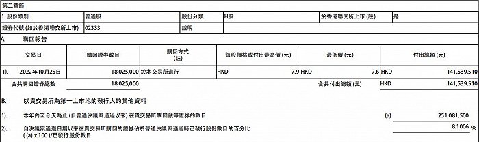 长城汽车10月25日公告,于当日斥资1.42亿港元回购1802.5万股公司股份,回购价格为每股7.6-7.9港元。