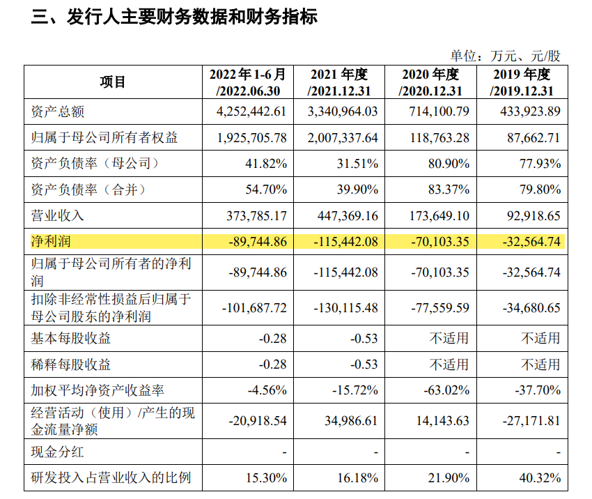 报告期内,公司净利润分别为-32,564.74 万元、-70,103.35 万元、-115,442.08万元及-89,744.86 万元,扣除非经常性损益后归属于母公司股东的净利润分别为-34,680.65 万元、-77,559.59 万元、-130,115.48 万元和-101,687.72 万元。公司以2021 年 8 月 31 日为基准日,整体变更为股份有限公司,截至 2021 年 8 月 31 日公司单体累计未分配利润(未弥补亏损)为-157,963.47 万元。2022 年 6 月末,母公司及合并口径累计未分配利润(未弥补亏损)分别为-62,771.68 万元和-159,671.84 万元。公司尚未盈利且存在累计未弥补亏损,主要是由于公司研发投入强度较高、产能爬坡以及原材料采购价格增长等因素造成。
