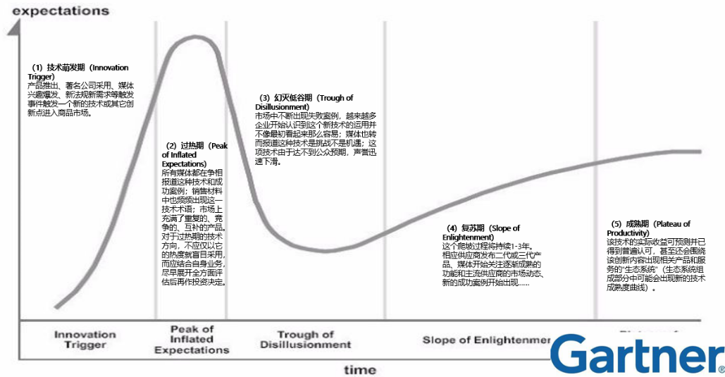 第四个阶段是复苏期,爬坡过程将持续1~3年,相应供应商发布二代或三代产品、媒体开始关注逐渐成熟的功能和主流供应商的市场动态、新的成功案例开始出现,最后进入成熟阶段。