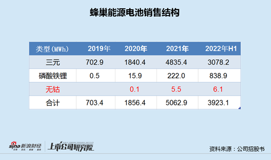 招股书显示,2019年问市当年,蜂巢能源无钴电池没有销量;2020年至2022年上半年,公司无钴电池累计仅销售11.7MWh。按每辆车60度电估算,仅够配套不足200台车。