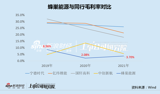 数据显示,2019年至2021年,蜂巢能源毛利率分别为8.56%、2.08%和3.70%,基本一直处于行业垫底的位置。