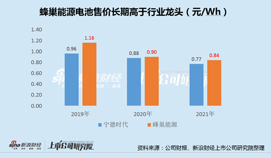 产品“卖的贵”并非一时而是一直。对比可以看到,2019至2021年,蜂巢能源的电池售价分别为1.16元/Wh、0.90元/Wh和0.84元/Wh,均高于同期龙头公司宁德时代。