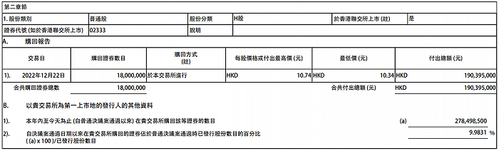 长城汽车12月22日在港交所发布公告,12月22日斥资约1.90亿港元回购股份1800万股公司股份,每股回购价格为10.34-10.74港元。