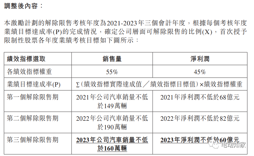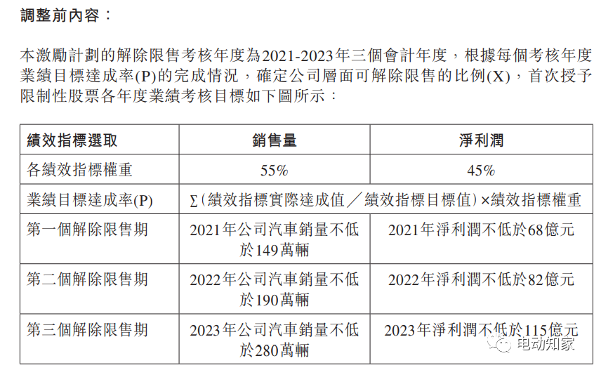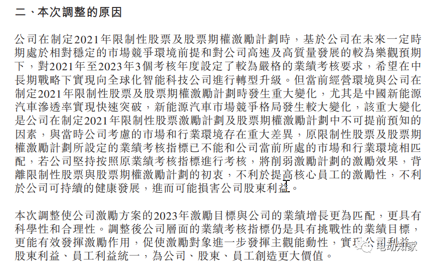 对于本次目标调整长城汽车方便也给出了原因:公司在制定2021年限制性股票及股票期权激励计划时,基于公司在未来一定时期处于相对稳定的市场竞争环境前提和对公司高速及高质量发展的较为乐观预期下,对2021年至2023年3个考核年度设定了较为严格的业绩考核要求,希望在中长期战略下实现向全球化智能科技公司进行转型升级。但当前经营环境与公司在制定2021年限制性股票及股票期权激励计划时发生重大变化,尤其是中国新能源汽车渗透率实现快速突破,新能源汽车市场竞争格局发生较大变化,该重大变化是公司在制定2021年限制性股票激励计划及股票期权激励计划中不可提前预知的因素,与当时公司考虑的市场和行业环境存在重大差异,原限制性股票及股票期权激励计划所设定的业绩考核指标已不能和公司当前所处的市场和行业环境相匹配,若公司坚持按照原业绩考核指标进行考核,将削弱激励计划的激励效果,背离限制性股票与股票期权激励计划的初衷,不利于提高核心员工的激励性,不利于公司可持续的健康发展,进而可能损害公司股东利益。本次调整使公司激励方案的2023年激励目标与公司的业绩增长更为匹配,更具有科学性和合理性。调整后公司层面的业绩考核指标仍是具有挑战性的业绩目标,更能有效发挥激励作用,促使激励对象进一步发挥主观能动性,实现公司利益、股东利益、员工利益统一,为公司、股东、员工创造更大价值。