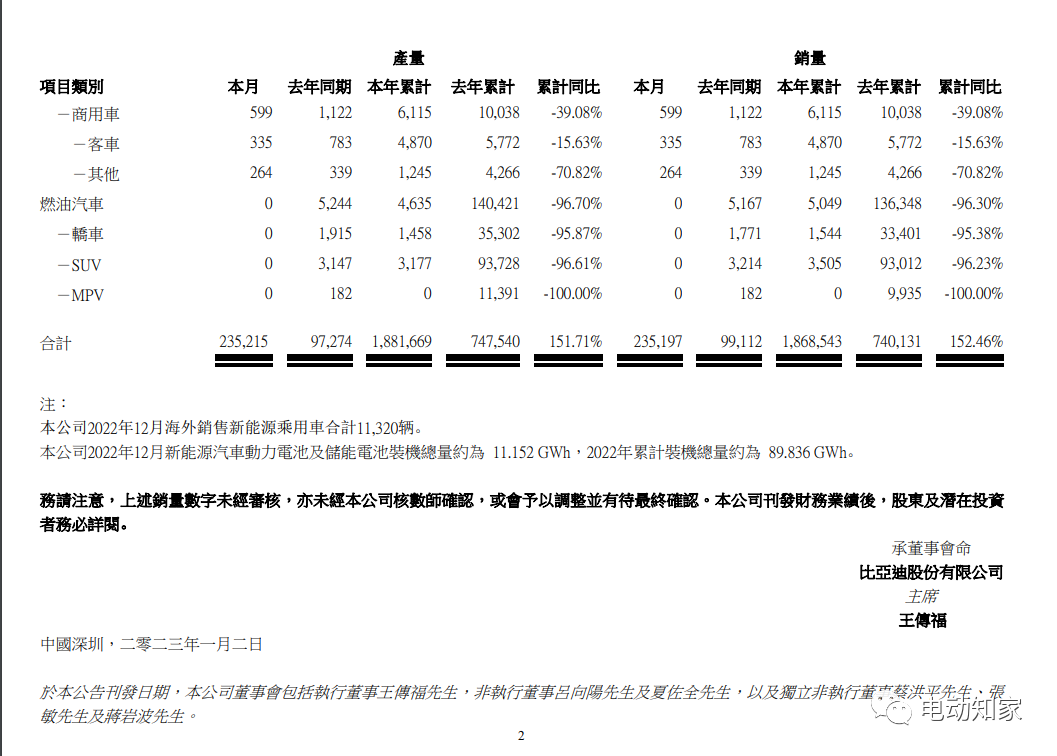 值得一提的是,与长城汽车形成鲜明对比的是比亚迪在停产油车后,2022年年销达186万辆。1月2日晚,比亚迪股份有限公司发布最新产销快报显示,2022年全年比亚迪汽车销量186.85万辆,同比增长152.46%,其中新能源乘用车销量185.74万辆(纯电动:91.11万辆;插电混动:94.62万辆),同比增长212.82%。