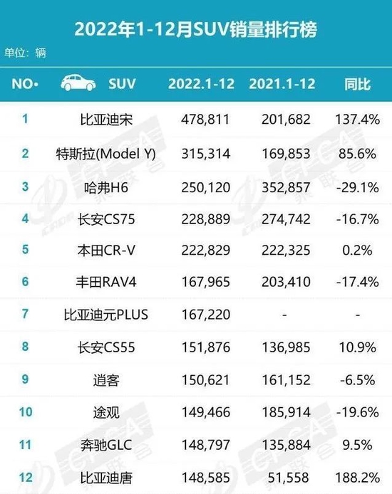 乘联会的数据显示,SUV细分市场,过去的神车哈弗H6被比亚迪宋、Model Y取代,排在前列的SUV,除了升级后推出7座版本的CR-V微增,合资品牌SUV均出现两位数下滑,而自主SUV能保住市场的也非常少了。