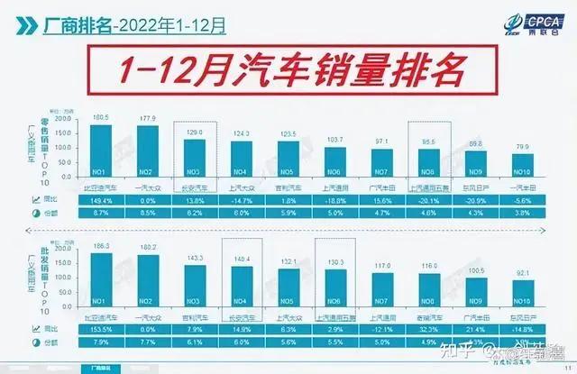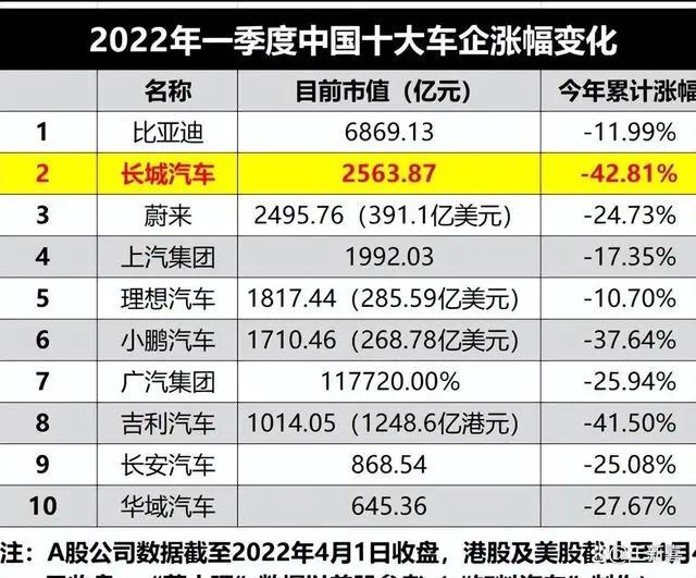 但是时间走到2022年,长城突然严重下滑,2022年第一季度,长城汽车却成为中国汽车巨头中最惨的一家,据“知料汽车”统计的数据显示,长城跌幅达到42.8%,位于国内十大车企跌幅榜首。而从全年行业排名来看,长城也已经跌出了前十。