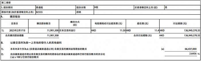 长城汽车2月17日在港交所公告,2月17日耗资约1.37亿港元回购1190.15万股H股股份,每股回购价格11.4港元-11.58港元。