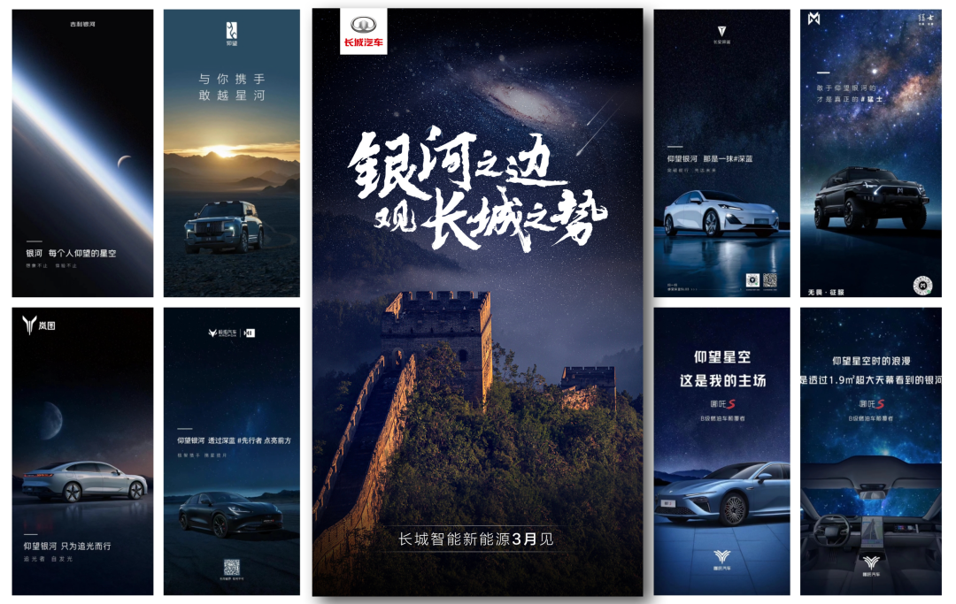 2月,吉利银河系列发布期间,几乎所有的中国汽车品牌同时以网络海报的形式抬头看向了夜空,甚至在2月23日,吉利银河发布会当天,长城汽车再次发海报称“银河之边观长城之势”,并在海报最下方配文“长城智能新能源3月见”,“火药味”十足。