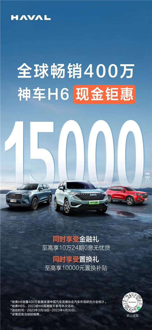 3月19日,哈弗品牌宣布开启限时优惠,2023年3月19日起至2023年4月30日购买哈弗H6可享1.5万元“现金钜惠”。同时还可享受至高10万24期0息金融礼,以及最高1万元置换礼。需要注意的是,哈弗H6S、2023款哈弗H6国潮版不参与本次活动。