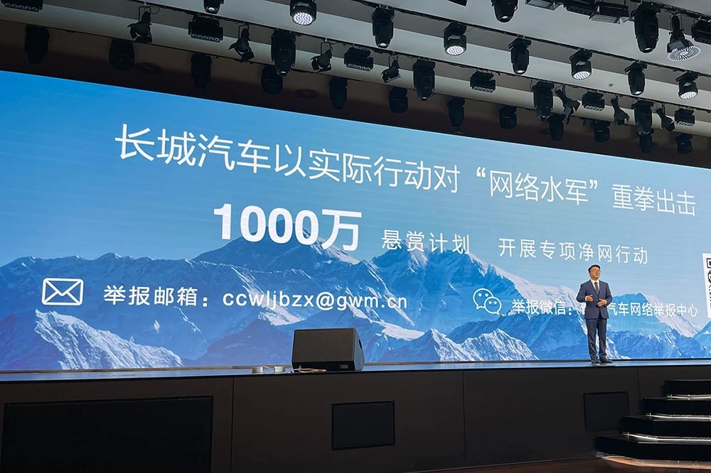 3月10日,长城汽车在自己举办的“智能新能源干货大会”上,悬赏1000万打击网络水军,目标直指某迪。在会上,长城汽车称,已收到举报信息500多条,主要涉及扭曲事实真相,无理由谩骂诋毁,民粹道德讨伐,组团口水引战等,在行业内形成劣币驱逐良币,部分资料已进入司法阶段。
