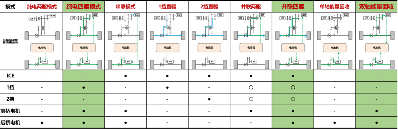 另外该动力系统,还能精准识别路况,智能调用前后轴双电机、混动专用发动机,实现纯电两驱模式、纯电四驱、串联模式、1挡直驱、2挡直驱、并联两驱、并联四驱、单轴能量回收、双轴能量回收9种模式的智能切换。可实现市区、市区急加速/爬坡、高速巡航、高速加速/爬坡、减速制动不同场景的使用需求。