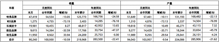 长城汽车4月7日公告,3月销量为9.02万辆,同比减少10.59%;1-3月销量22.00万辆,同比下降22.41%。
