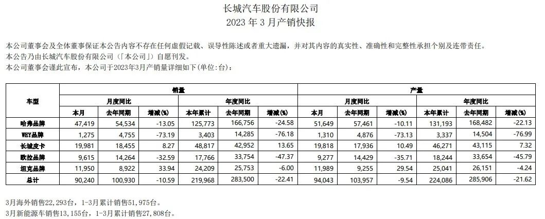 根据长城汽车发布的2023年3月产销快报,杠杆游戏注意到,3月该司销售汽车9万余辆,2022年同期则超10万辆。