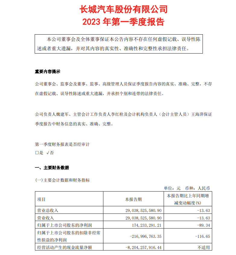 4月25日记者日前从长城汽车股份有限公司发布的2023年第一季度报告中获悉,该公司报告期内营收和利润均出现了不同程度的下滑。具体来看,在今年第一季度中,长城汽车期内取得营业总收入290.39亿元,同比下滑13.63%;归母净利润1.74亿元,同比下滑89.34%。扣非净亏损2.17亿元,同比下滑116.65%。基本每股收益0.02元/股,同比下滑88.89%。