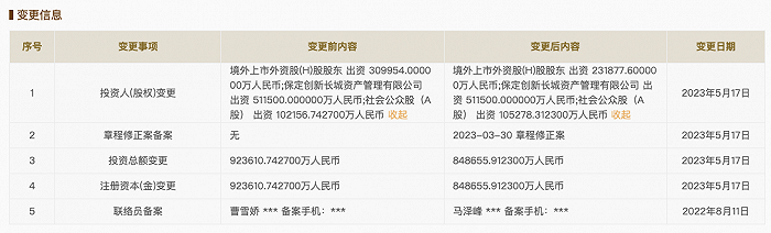 国家企业信用信息公示系统网站显示,5月17日,长城汽车股份有限公司发生工商变更,注册资本由约92.36亿人民币减至约84.87亿人民币。该公司成立于2001年6月,法定代表人、董事长为魏建军。