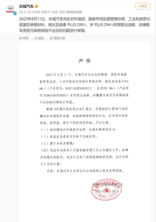 5月25日10:40,长城汽车在微博公开举报比亚迪部分PHEV车型排放不达标;