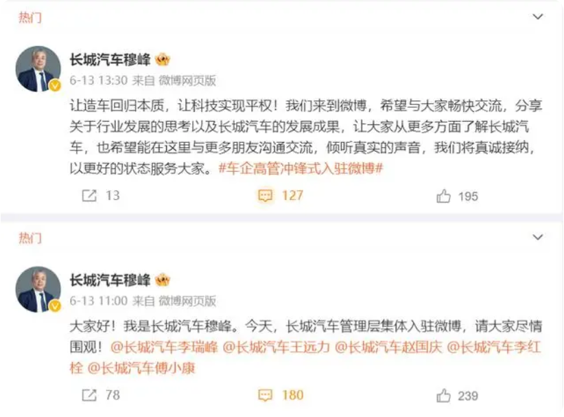 6月13日,长城汽车高管集体入微博也引发市场热议,同日,“车企高管冲锋式入驻微博”这一话题登上热搜。
